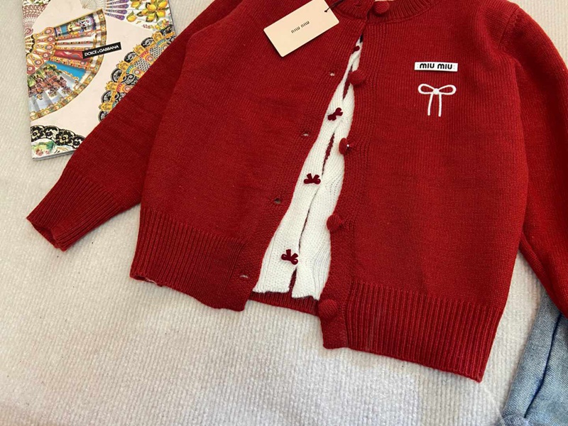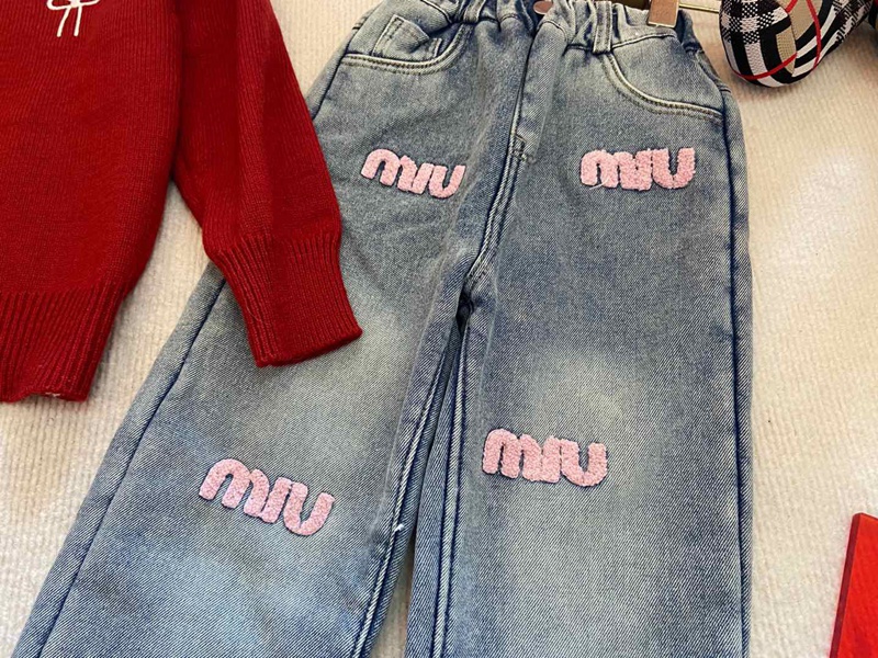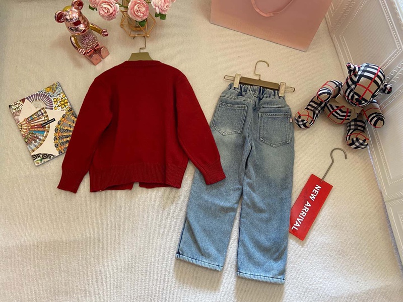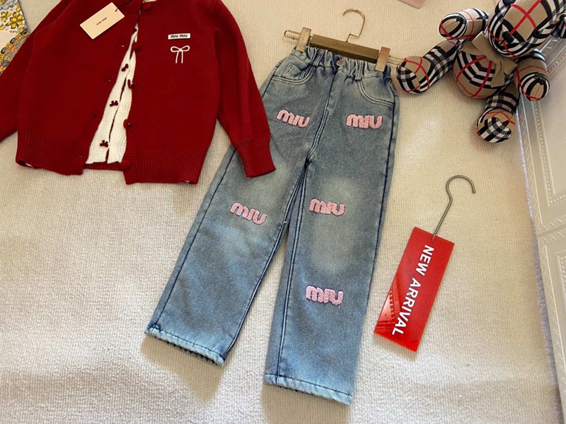 商品名:MiuMiuキッズセットアップ 女の子 ミュウミュウカーディガン デニムパンツ 2点セット ニット 上下セット 子供服 セットアップ 洋服 長袖 セーター トップス デニムズボン